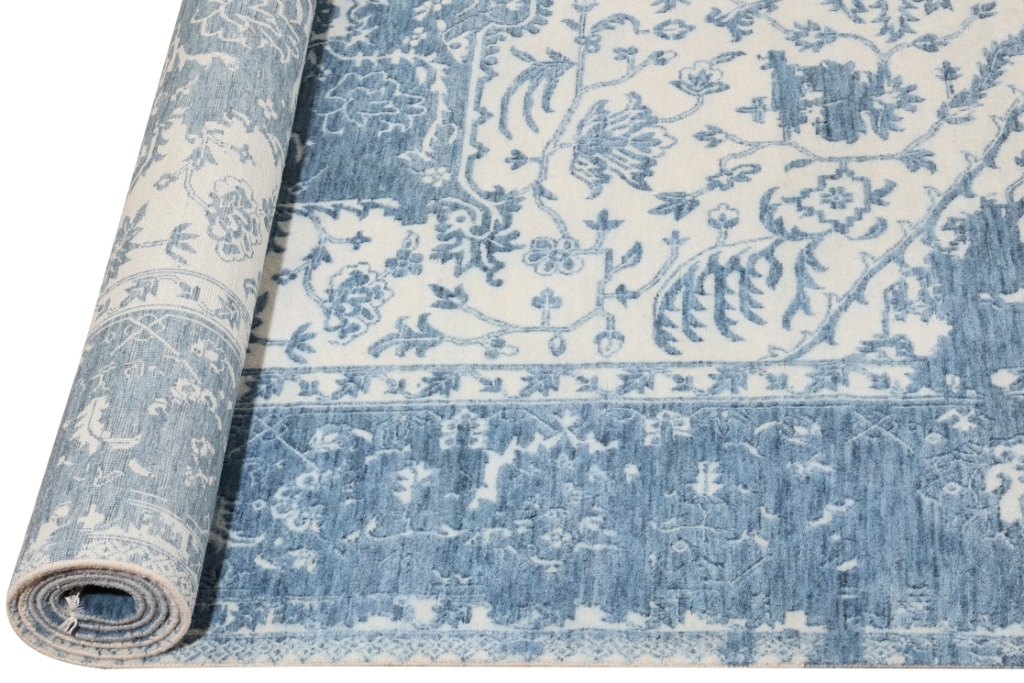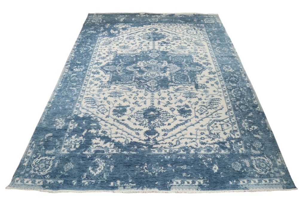 This one-of-a-kind rug with its Persian motifs in an ocean blue randomly distorting a soothing soft cream ground, will surely breathe life into those one-of-a-kind spaces of your homes.
